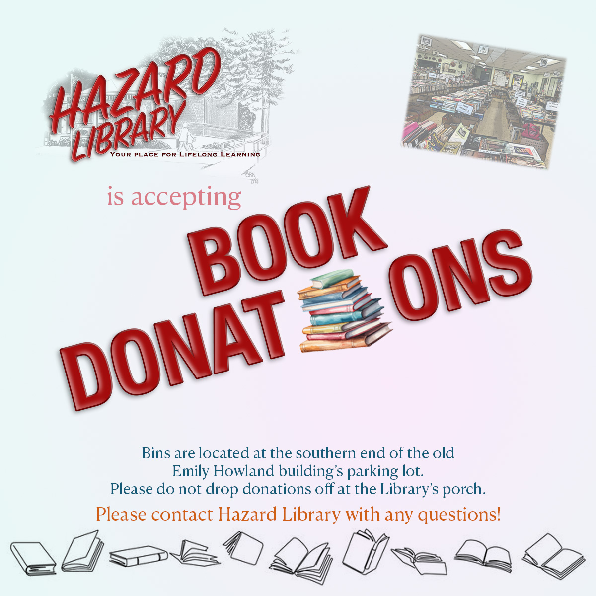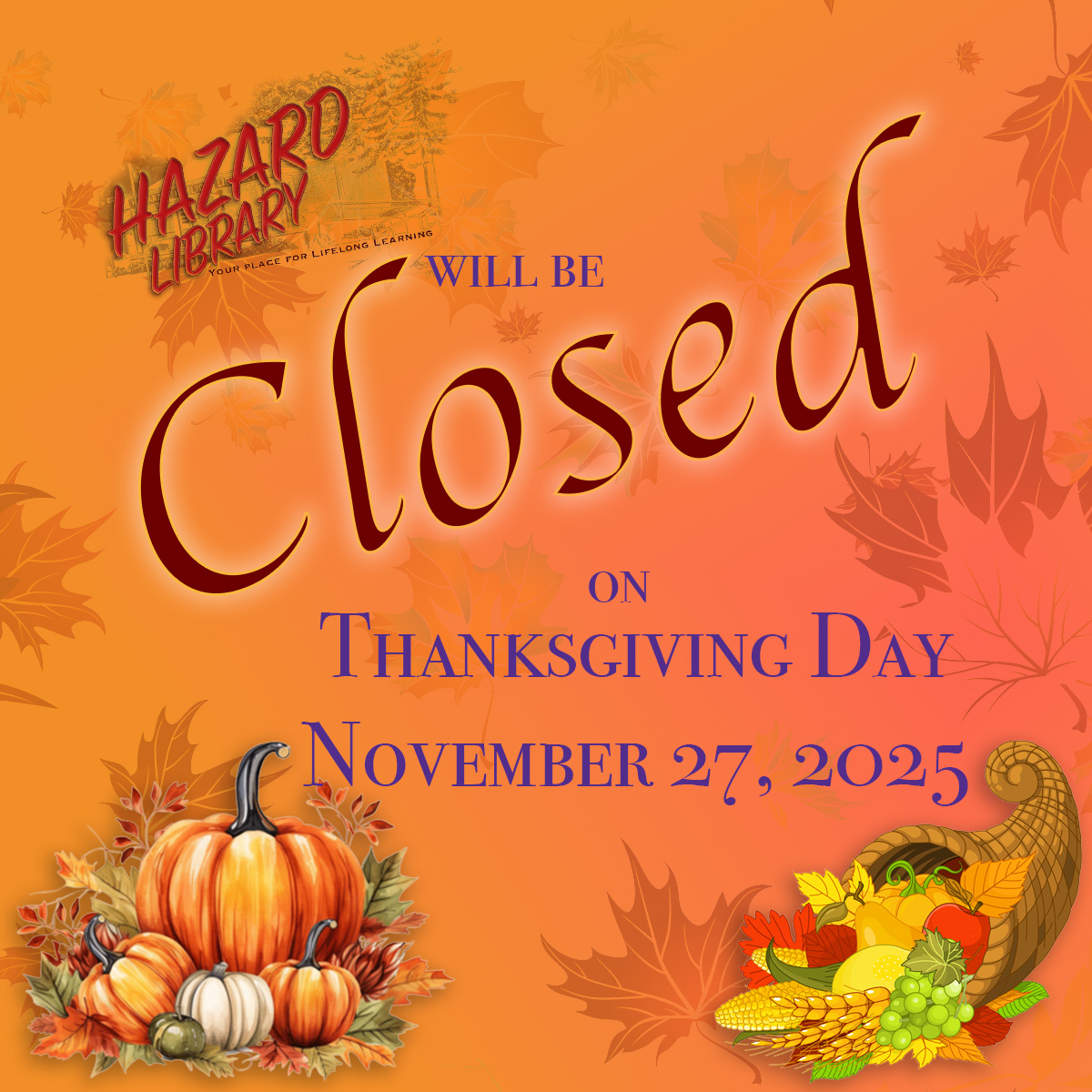 Information related to closings will be posted on the Hazard Library Facebook Page, the website, and on TV channels 3, 5 and 9. Patrons are advised to call the library when openings/closings are in question.