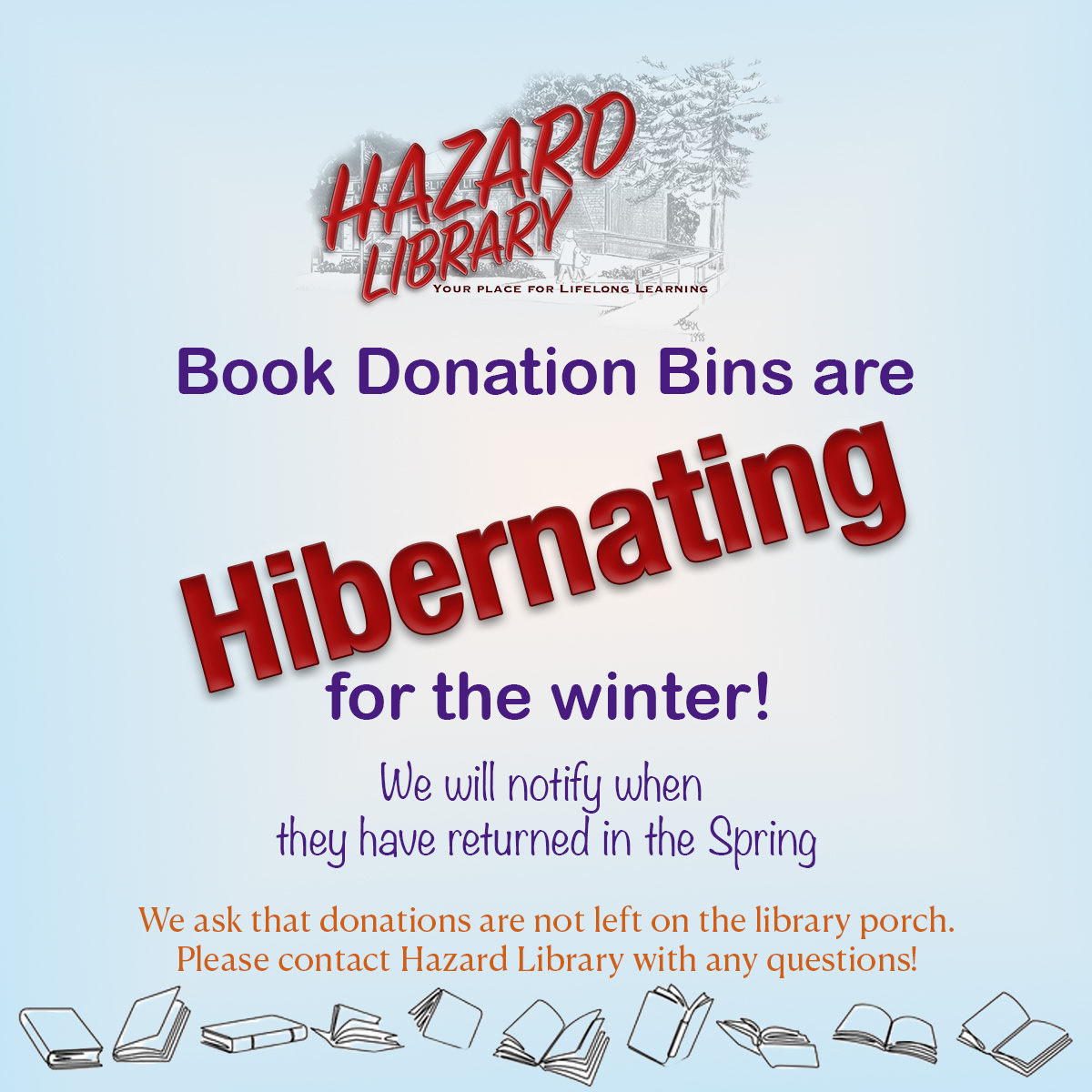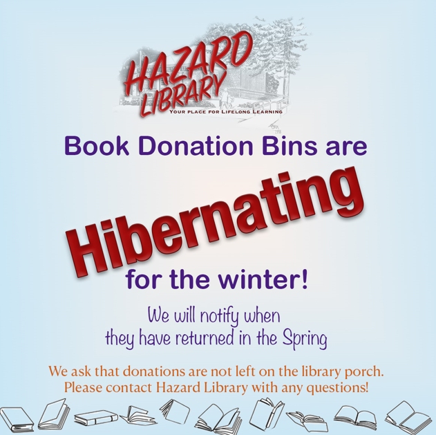 Our book donation bins are hibernating for the Winter. We will notify when they return in the Spring. Please wait to donate until the bins have returned (or contact the library to make arrangements – librarian@hazardlibrary.org or (315) 364-7975).