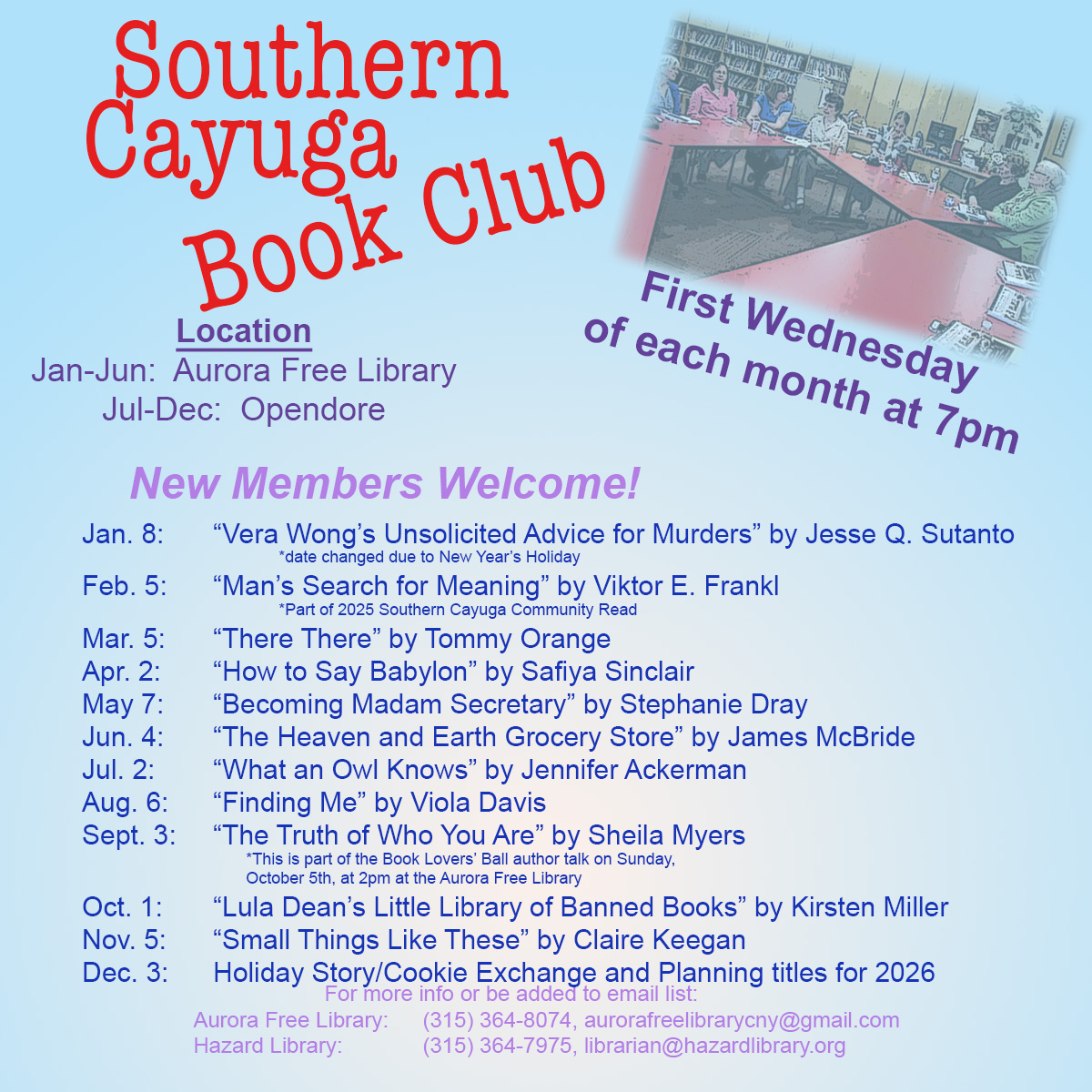 Southern Cayuga Book Club meets every first Wednesday of the month at 7pm. The Club meets at Aurora Free Library during the months of January through June. The club then meets at Opendore during the months of July through December. New members are welcome to join as this is open to the community!!