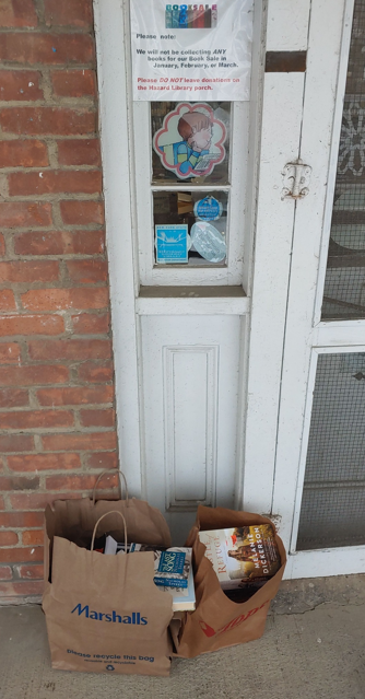 Please Note: We ask that you don’t drop items off on the library porch. Also, we do NOT accept donations of magazines, encyclopedias, text books, or VHS tapes.